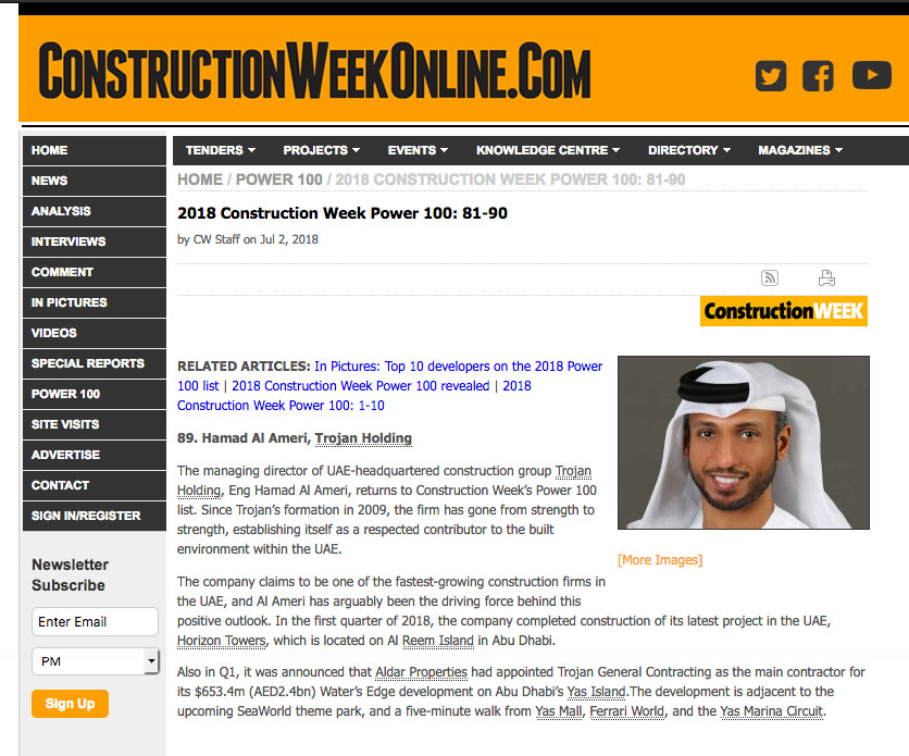 عاد المدير التنفيذي لمجموعة تروجان ومقرها الإمارات العربية المتحدة ، المهندس حمد العامري ، إلى قائمة Construction Week’s Power 100. منذ تكوين تروجان في عام 2009 ، انتقلت الشركة وأثبتت نفسها كمساهم محترم في اعمال البناء داخل الإمارات العربية المتحدة.