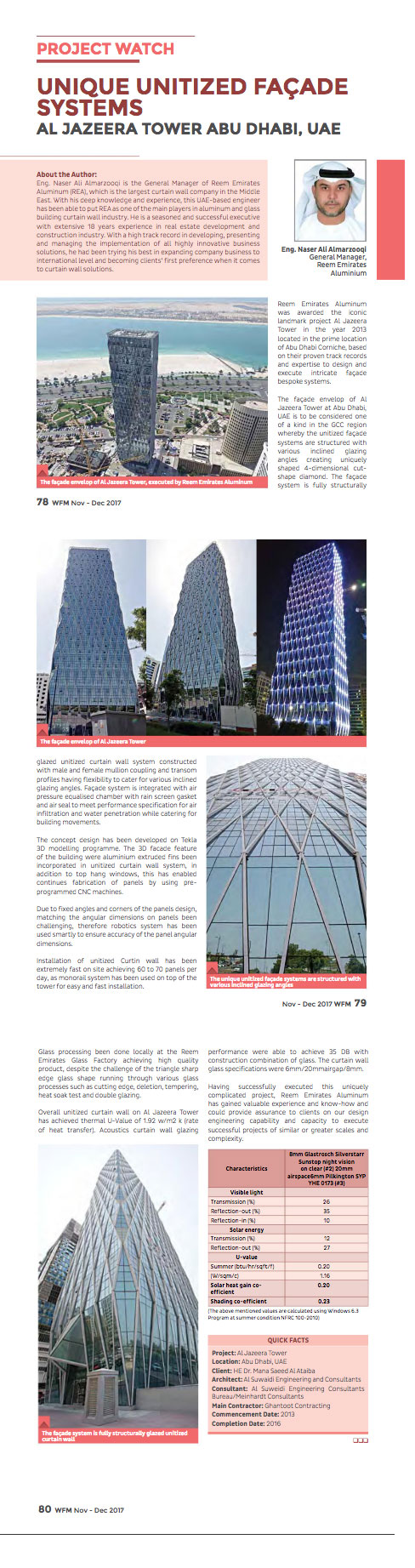 Window & Façade Magazine is featuring REA’s project Al Jazeera Tower. An interview was conducted with REA GM, Eng. Naser Al Marzooqi to highlight one of the iconic project.